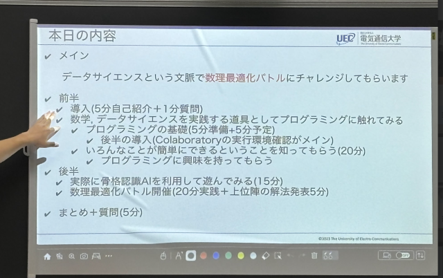 デジタル社会が進展する中で、データを読み解き活用する力はこれからの時代を生きる若者にとって必要不可欠なスキルとなっています。今回の講義を通じて、生徒たちにとってデータサイエンスが身近で実用的な学問であることを実感してもらえたのではないでしょうか。 今後も電気通信大学データ教育センターでは、より多くの中学・高校生がデータの力を体験し、将来の可能性を広げられるよう、出張講義や教材開発に取り組んでまいります。データ活用能力を身につけることで、生徒たちが社会の課題解決に貢献できる人材として成長していくことを願っています。